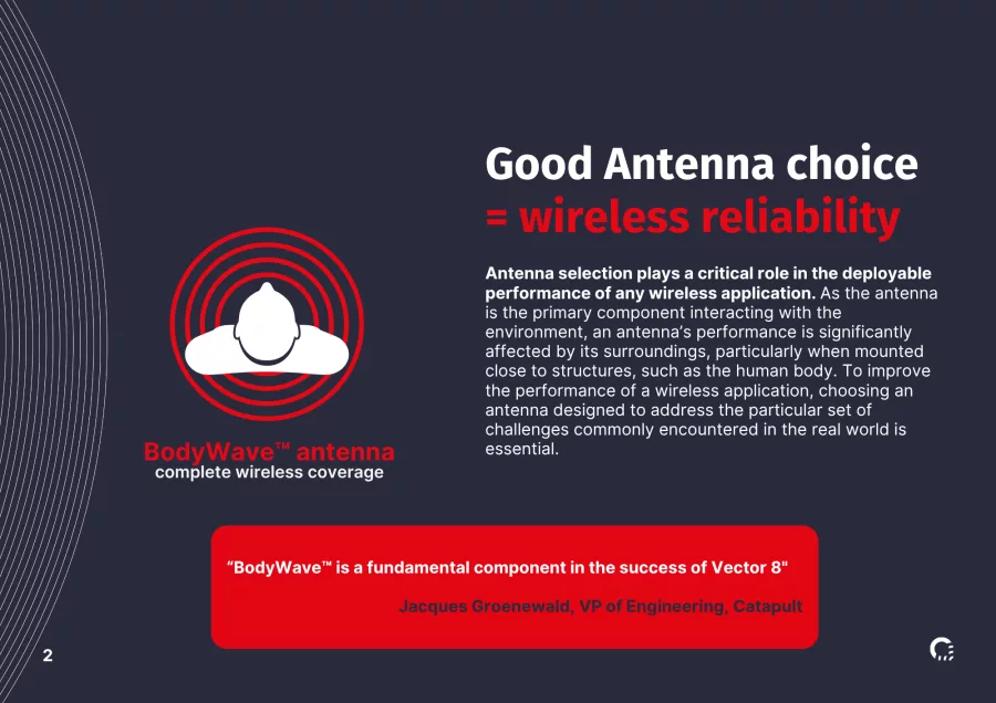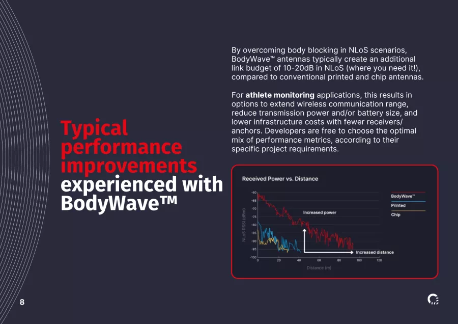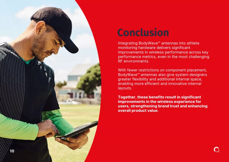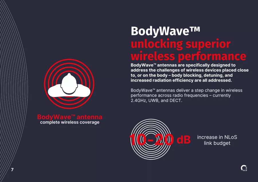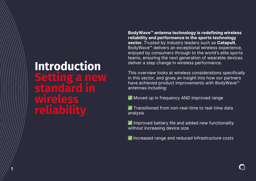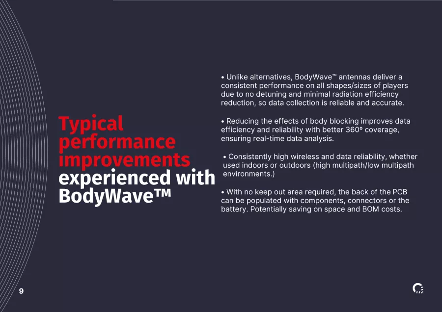 BodyWave™ antenna technology is redefining wireless reliability and performance. Trusted by industry leaders, BodyWave™ delivers an exceptional wireless experience, enjoyed by consumers through to the world's elite sports teams, ensuring the next generation of wearable devices deliver a step change in wireless performance.
